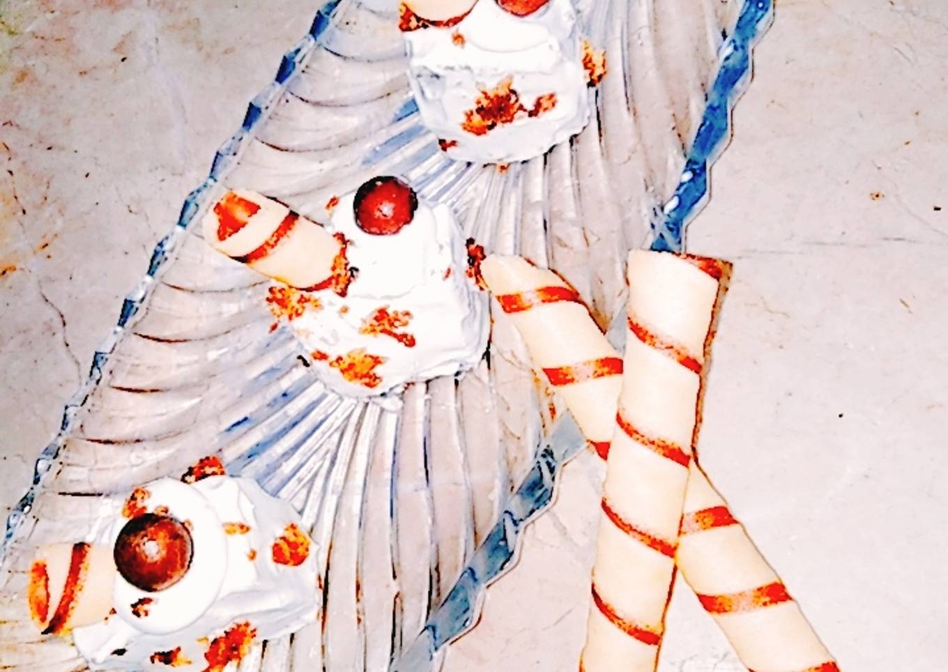 - Now in a pipping bag add cream and make a design of your choice on the top of the pastry... Crumb 1 to 2 pieces of cake and sprinkle on pastry... Decorate it with chocolate balls /nibbles and wafers... Now yummy yummy mini pastries is ready.....