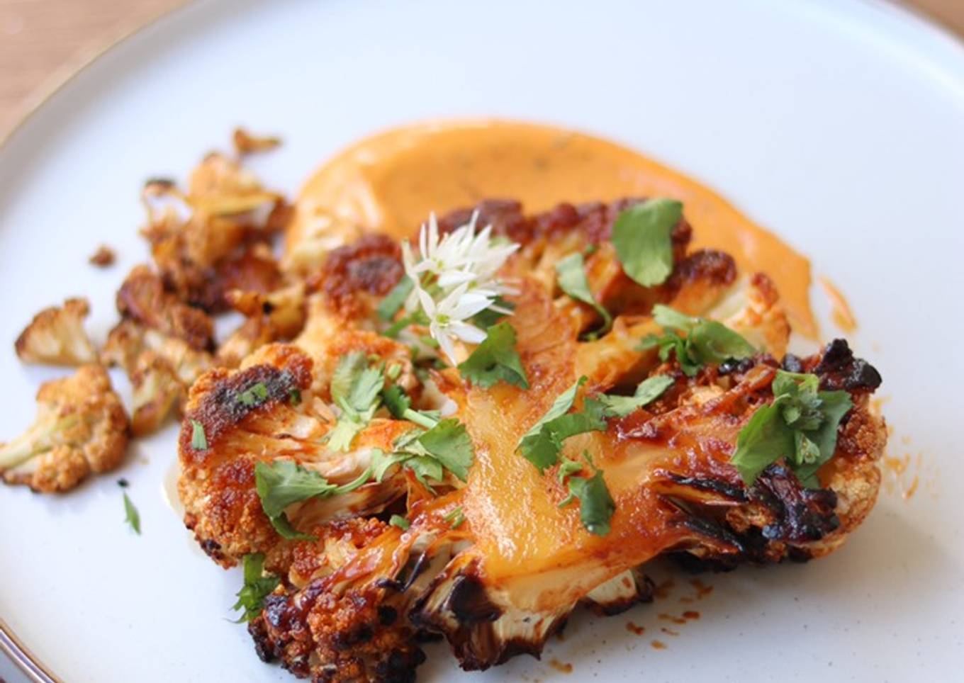 - Plate up, mix Gochujang sauce with mayo and spoon on the plate, add roasted cauliflower steak and cauliflower crumbs. Garnish with coriander and wild garlic flowers or any other herb.