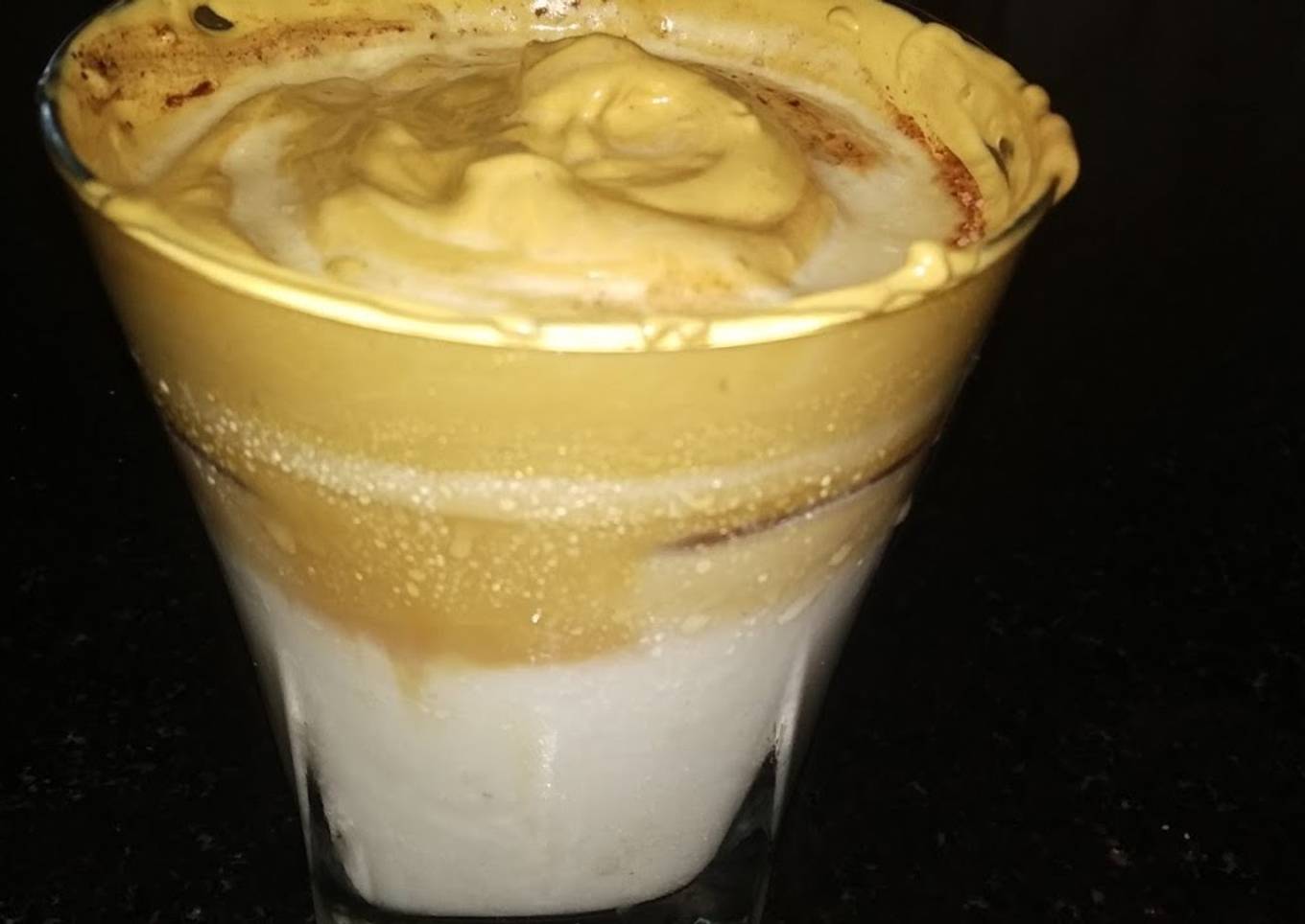 - With a straw, gently stir a part of the coffee cream into thr milk and enjoy dalgona coffee.