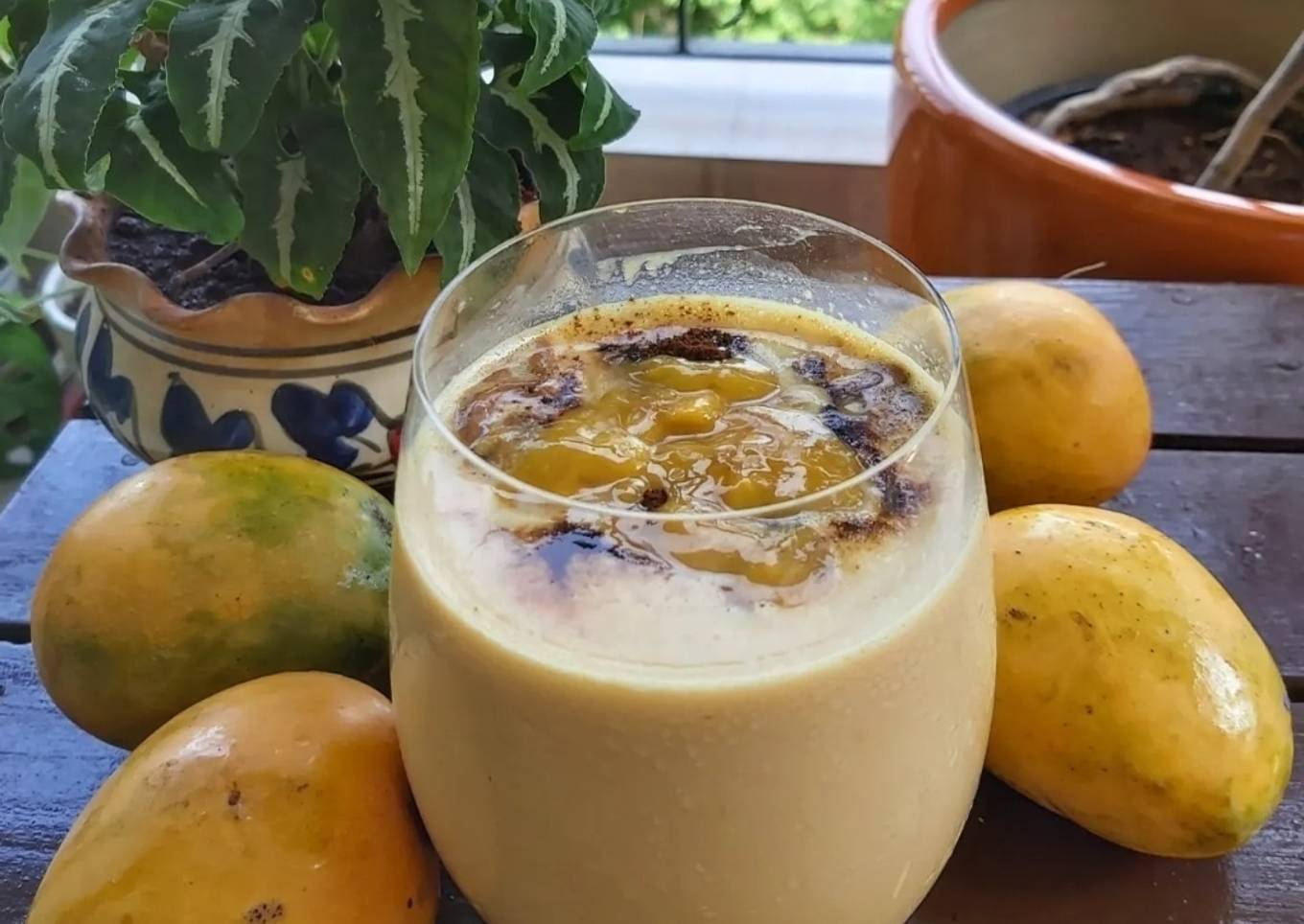 - Top the latte with some more mango pulp and sprinkle some coffee. Add sugar if needed to the latte.