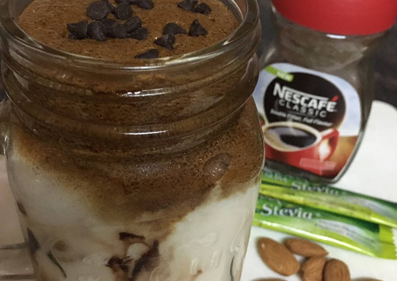 - Now beat coffee + drinking chocolate +stevia + boiling water together until get stiff peak cream